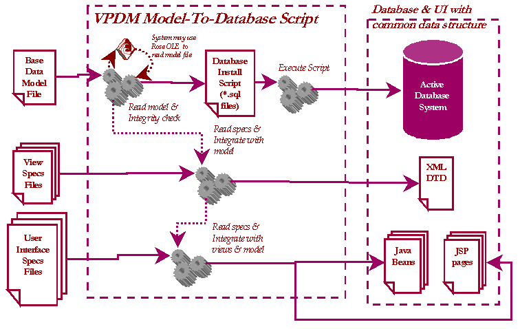 Additionally we will be able to generate user interfaces and data encapsulation methods that themselves use the VPDMf directly. We discuss these issues in the next section. The following diagram illustrates the process of generating a database system within a linked user interface from a single model file with descriptions of views and interface parameters. The Base Data Model file is parsed and manipulated by VPDMf to generate an installation script for the database (which then may be executed from within the VPDMf). The VPDMf representation forms the basis for the definition of views (which may be used as XML documents), which then forms the basis for the necessary files underlying a simple user interface.