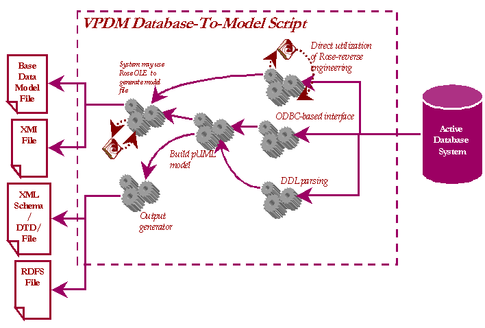Figure 2: An example of the design of a reverse engineering paradigm in the VPDMf. Output systems (forward-engineering)The VPDM framework is intended to generate systems from schema. The fact that different systems generated from the same schema has the same design simplifies development work enormously. We want to be able to automatically generate database schema in one step. The systems we intend to be able to use his for are.