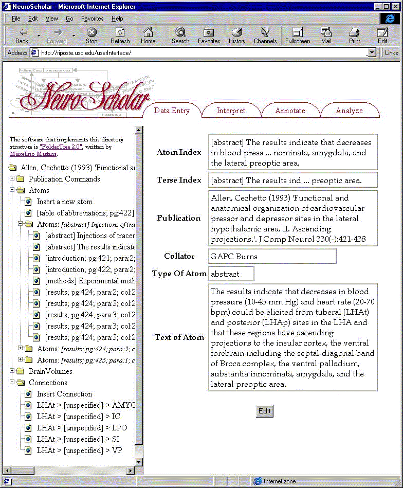 Figure 3: A sample screenshot from an early implementation of a VPDMf-enabled system. This image shows a navigation tree in the left hand pane (as a represention of the vGraph) and the data attributes comprising a specific view (in this case, showing the text atoms or 'fragments' that form a document in the NeuroScholar system). We break this down into two categories:
